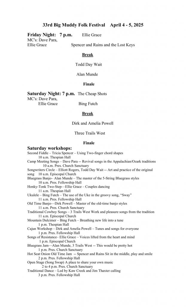 Friday: Ellie Grace, Spencer and Rains and the Lost Keys, Todd Day Wait, Alan Munde Trio